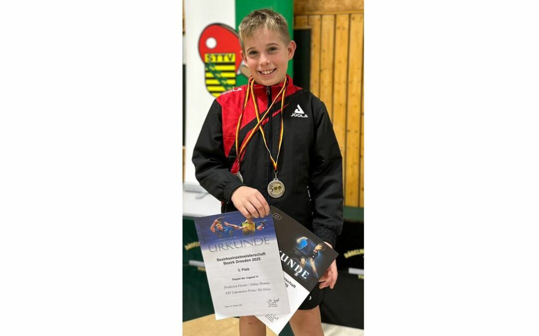 Im Einzel und im Doppel machte Frederick Förster seine Leistungssteigerung deutlich und arbeitete sich in beiden Spielmodi durch die Partien bis ins Halbfinale, wo er sich, nach großer sportlicher Leistung, im Einzel dem späteren Zweitplatzierten geschlagen geben musste. Auch im Doppel konnte er Qualität zeigen und unterlag mit seinem Mitspieler von der SG Oelsa nur den späteren Siegern. Damit hat er sich das Ticket für die Landesmeisterschaften in der Altersklasse U11 am 15.11.2025 gesichert!